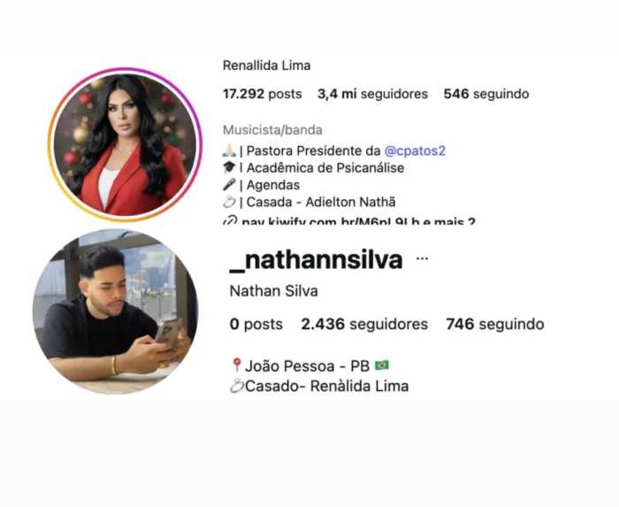 A líder religiosa alterou sua biografia na plataforma para “Casada – Adielton Nathã”, encerrando semanas de especulações sobre seu atual estado civil. Já o músico, que integra o ministério de louvor da igreja presidida por Renálida em João Pessoa (PB), também atualizou sua descrição para “Casado – Renálida Lima”, confirmando publicamente o relacionamento.